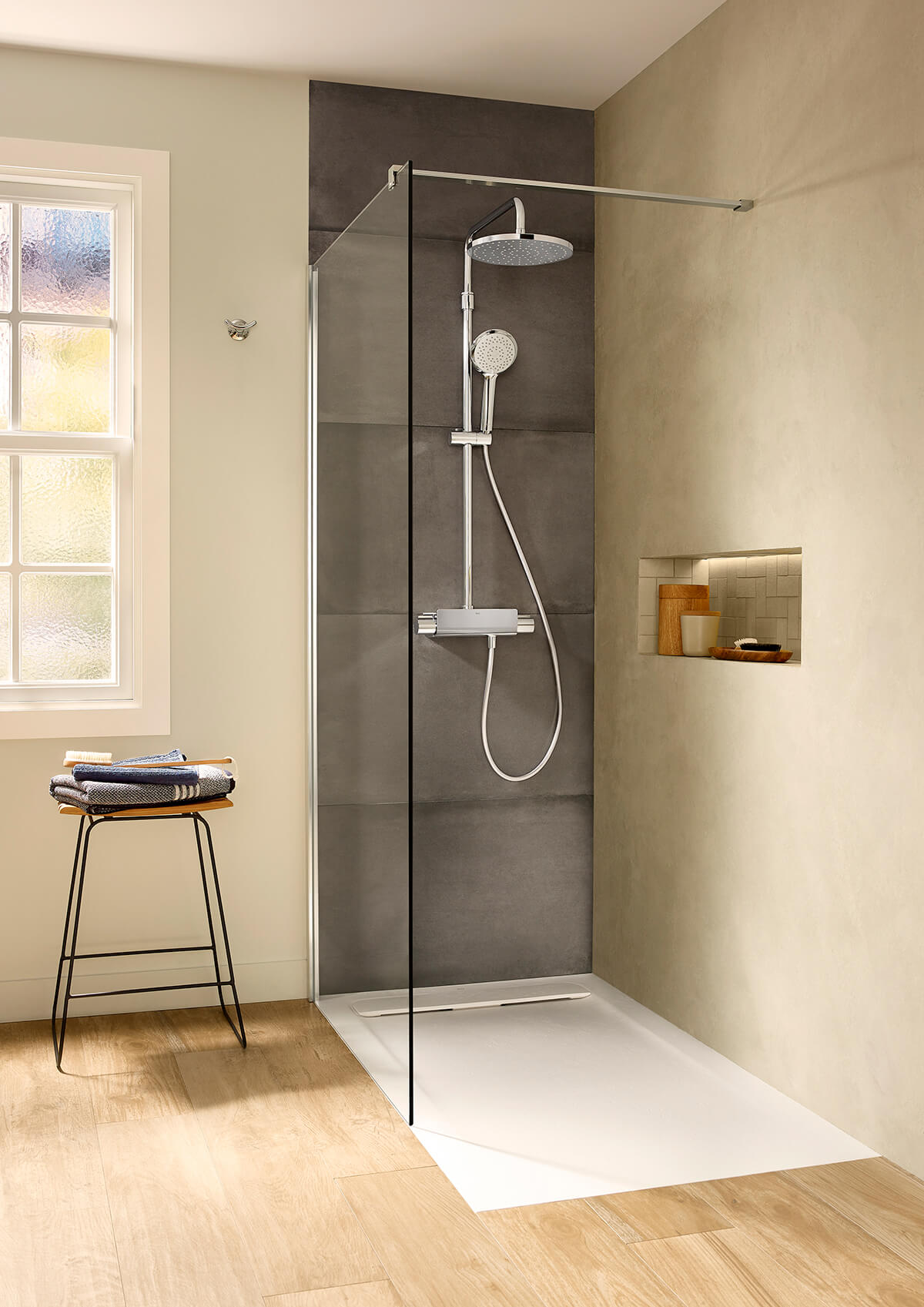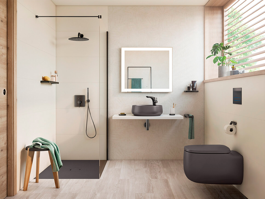 Inną opcją jest wybór brodzika z ceramiki Senceramic®, dostępnego w pięciu różnych wykończeniach: matowym białym, beżowym, kawowym, perłowym i onyksowym. Model Cratos z okrągłym odpływem z tego samego materiału co powierzchnia, pozwala na tworzenie atmosfery z własną charyzmą. Przykładowo, beżowy brodzik może stworzyć ciekawy efekt wizualny z białą ceramiką czyli wc i umywalką czy intensywność brązowego odcienia doda wyrazu każdej przestrzeni łazienkowej.