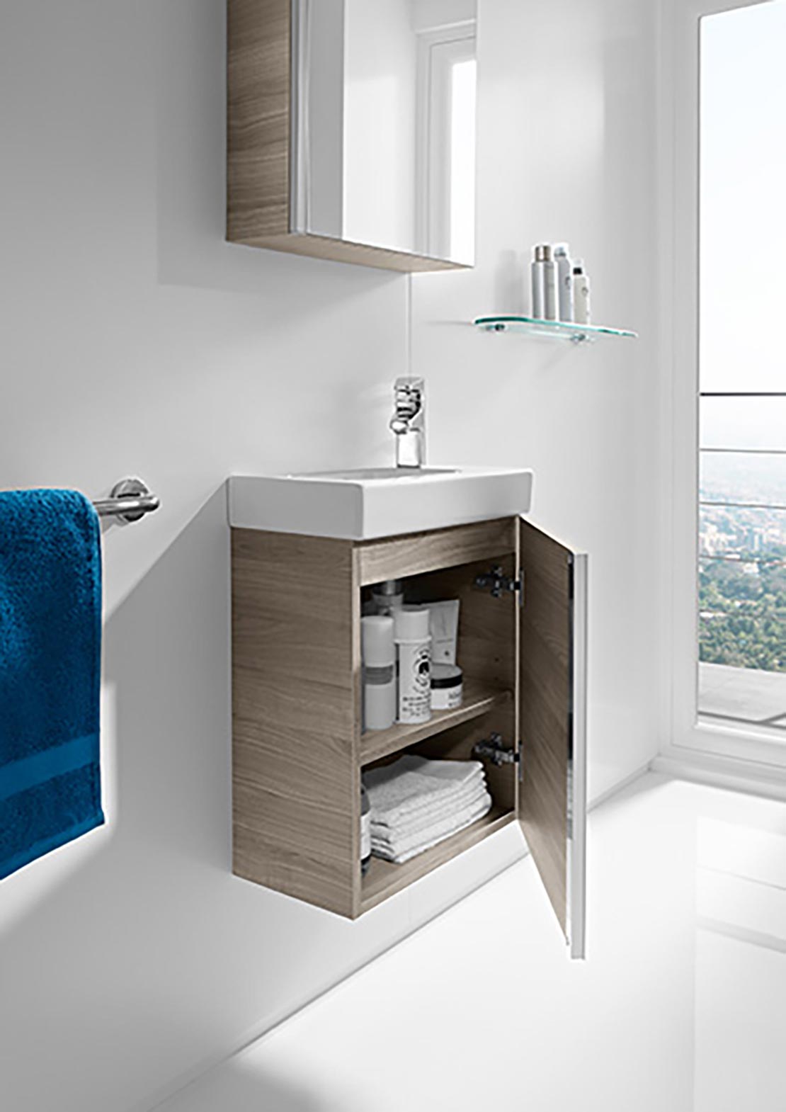 Prostota, funkcjonalność- to cechy charakterystyczne dla mebli Mini- dedykowanych przede wszystkim miejskim, małym łazienkom. Zestaw mebel z umywalką zapewnia maksymalne wykorzystanie przestrzeni. Ich geometryczna forma z chromowanymi listwami jest bardzo estetyczna. A kolor dębu dodatkowo nadaje im szyku. I w ten sposób w niewielkiej łazience zyskujemy odrobinę pięknie podanej przestrzeni do przechowywania
