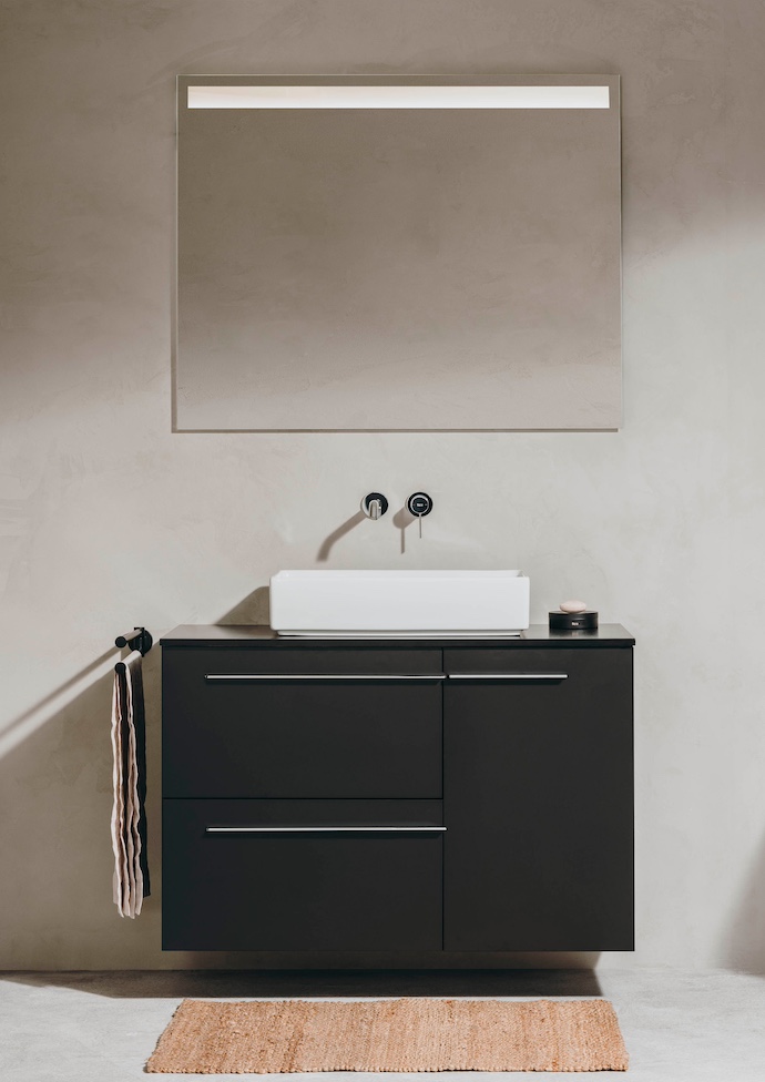 Wybierz wiszące meble łazienkowe. Dzięki montażowi bezpośrednio na ścianie zwalniają one miejsce na podłodze, co optycznie powiększa łazienkę i ułatwia jej sprzątanie. Tego typu rozwiązanie znajdziesz w bogatej ofercie najnowszej kolekcji Tura. Tura to powrót do esencji przeszłości, ale wymyślonej na nowo. Szuflady zaprojektowano z myślą o maksymalnej funkcjonalności, a zastosowanie wbudowanego syfonu zapewnia dużo miejsca do przechowywania. Meble Tura są dostępne w wersji asymetrycznej, z dolną otwartą półką, jedną szufladą, z dwoma szufladami lub dwoma szufladami i otwartą półką boczną. Filcowe dodatki łazienkowe nadają charakteru, zaprojektowane zostały w sposób, który umożliwia używanie ich na wiele sposobów. Pojemniki do przechowywania są lekkie, trwałe i dostępne w dwóch rozmiarach. Pokrywę z korka pochodzącego z recyclingu, można wykorzystać jako