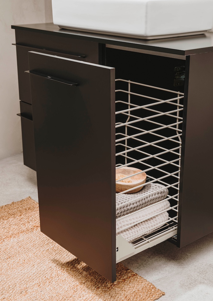 Jeśli preferujesz czysty i minimalistyczny wygląd, zarówno w małej jak i dużej łazience możesz zdecydować się na modułowe meble Kwadro lub kolekcję Ella. To szeroki wachlarz rozwiązań dostępnych na wyciągnięcie ręki. Dzięki modułowej budowie możesz tworzyć praktyczne zestawy, które zapewniają wygodne przechowywanie i pomagają utrzymać porządek. Nowoczesny design, szeroki wybór kolorów i wykończeń sprawiają, że meble łatwo dopasować do stylu wnętrza. Kolejną praktyczną cechą jest kosz cargo to doskonały sposób, by optymalnie zagospodarować przestrzeń. Jest idealnym rozwiązaniem do przechowywania środków czystości, detergentów czy zapasowych ręczników, które chcemy mieć zawsze pod ręką, a jednocześnie dyskretnie schowane. To przede wszystkim dobrze zorganizowane miejsce na brudne pranie. Kosze cargo zamontowane na prowadnicach z funkcją cichego domykania zapewniają komfort użytkowania, eliminując hałas i zapobiegając przypadkowemu trzaskaniu. To rozwiązanie, które nie tylko ułatwia organizację, ale też podnosi standard codziennego użytkowania łazienki.