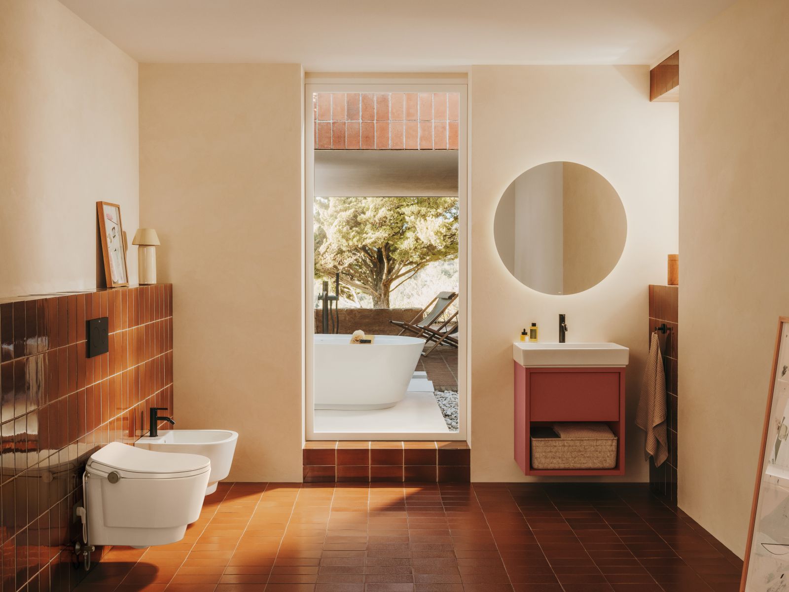 Równowagę dla równowagę dla kolorów ziemi przynoszą pastelowe błękity, kojarzone z wodą, powietrzem i poczuciem lekkości. Te delikatne odcienie wprowadzają do łazienki świeżość i optycznie powiększają przestrzeń, dlatego szczególnie dobrze sprawdzają się w mniejszych wnętrzach. Uzupełnieniem palety są odcienie terakoty – ciepłe, organiczne i nawiązujące do tradycyjnej ceramiki. W 2026 roku pojawiają się one zarówno w formie płytek, jak i mebli czy dodatków, nadając wnętrzom głębi oraz przytulności.