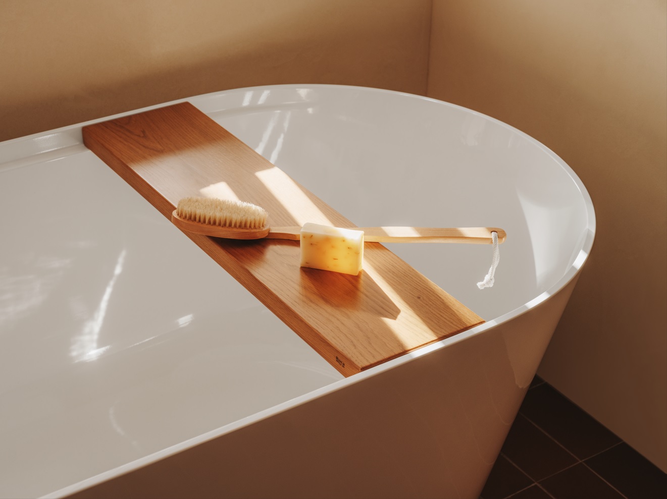 Drewniana, certyfikowana FSC® półka, została zaprojektowana tak, aby idealnie oraz w nieskomplikowany sposób dopasować się do krawędzi wanny. Jest to funkcjonalny oraz estetyczny detal, który doskonale uzupełnia projekt wanny i wprowadza do przestrzeni unikalnej łazienki naturalny element