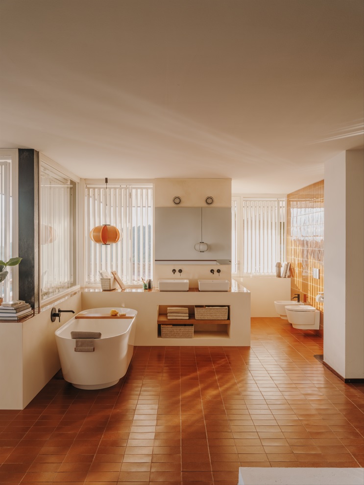 Wanna Tura jest jednocześnie obszerna i lekka, a jej ergonomiczna konstrukcja jest przeznaczona do odpoczynku i relaksu. Jej unikalny kształt został zainspirowany architektonicznym systemem wspornikowym, który sprawia wrażenie, że wanna unosi się w powietrzu, a sama aranżacja łazienki wygląda spektakularnie. Wanna Tura wykonana jest z innowacyjnego materiału Stonex®, który pozwala na uzyskanie bardzo precyzyjnych kształtów oraz cienkich ścianek. W ten sposób powstała funkcjonalna i subtelna za razem krawędź wanny, na drewnianą półkę.